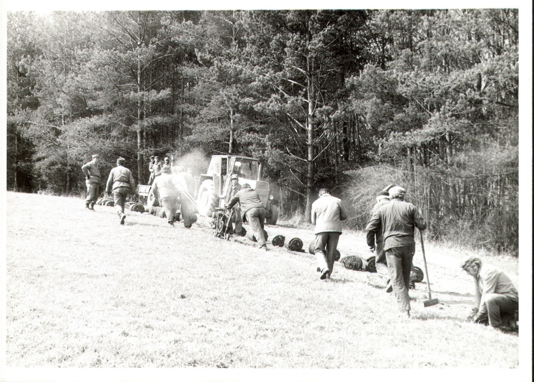 Prvé ihrisko bolo postavené v roku 1930 za podpory cementárne na voľných priestranstvách pri Váhu. V roku 1932 bolo vybudované nové ihrisko priamo v obci (na miestne dnešných bytoviek) pri železničnej stanici, pretože staré muselo ustúpiť výstavbe elektrárne. Celkom nové ihrisko vedľa železničnej trate bolo postavené v roku 1938 a tréningovým účelom slúži dodnes. Fotky mapujú výstavbu dnešného ihriska a patria medzi významný historický medzník vo vývoji športu v Ladcoch ale aj v živote Ladiec vôbec.